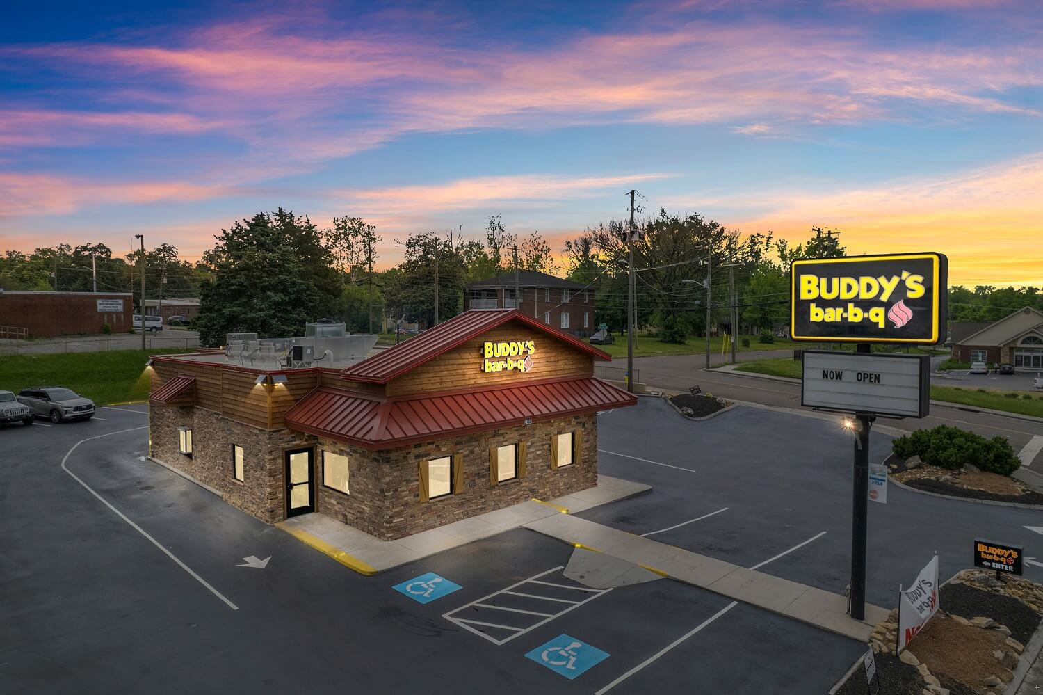 Creative Structures, Inc. renovated 2,500 square feet of the iconic East Knoxville Buddy's Bar-B-Q after a fire damaged the original structure. The project included rebuilding the roof trusses and installing a completely new kitchen, smoke room, and dining room. Architectural features were also added to align with their modern prototypes.
