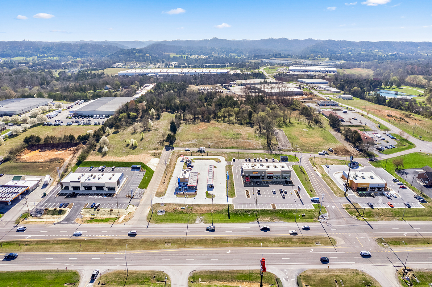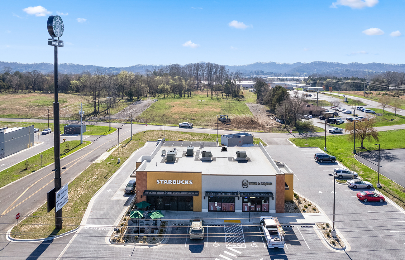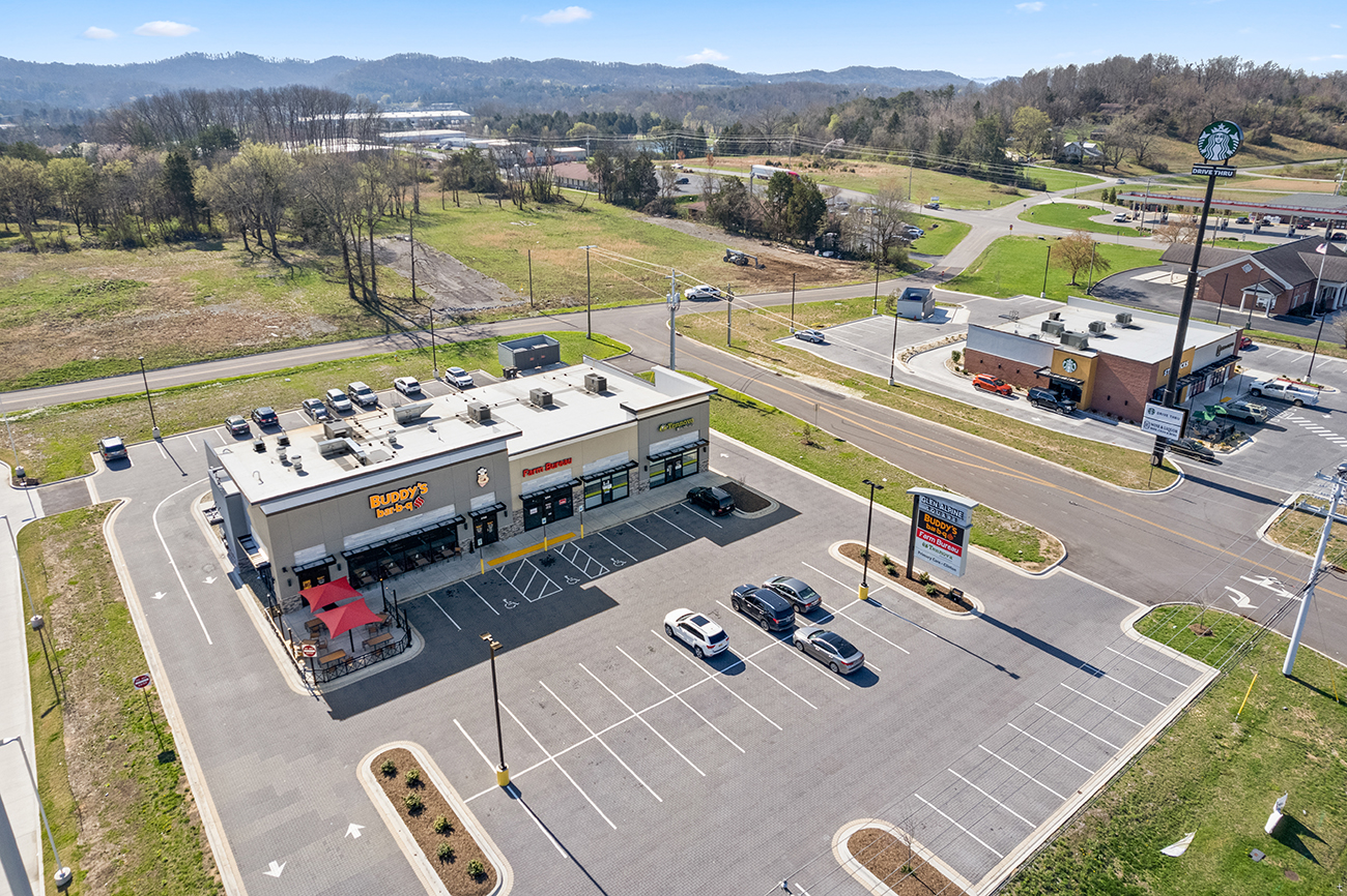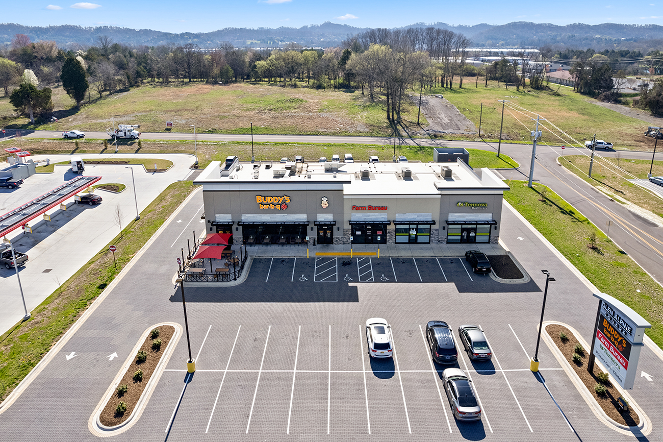 Shell space utilizing multiple facaded styles for contrasting storefronts, storm water was contained using permeable pavers throughout the parking lot.