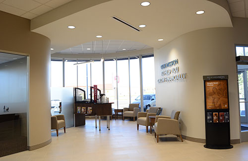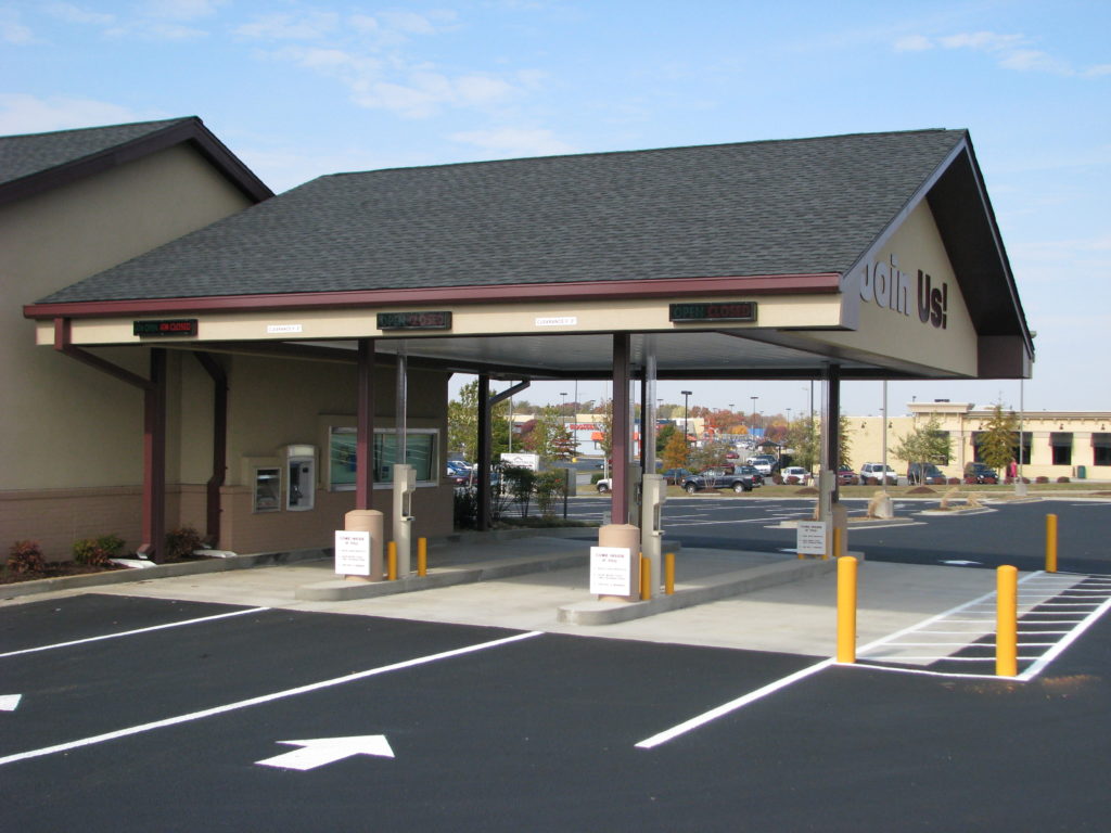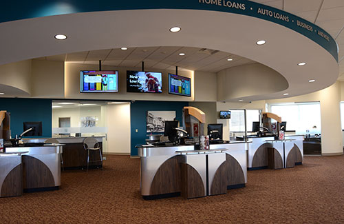 The new branch design has an arched entryway with a barreled roof, exposed laminated beams and architectural concrete floors. Large elevated windows allow natural light into the lobby.